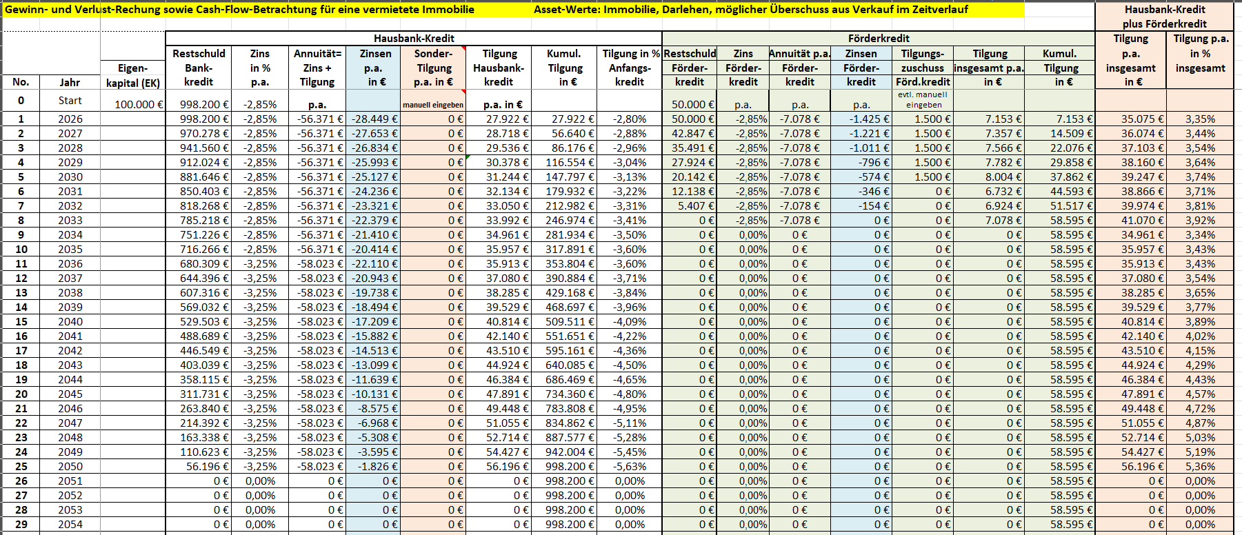 Die Szenario-Kalkulation kann auch einen Förderkredit mit Tilgungszuschüssen berücksichtigen, der zeitgleich mit dem 1. Bankkredit startet.