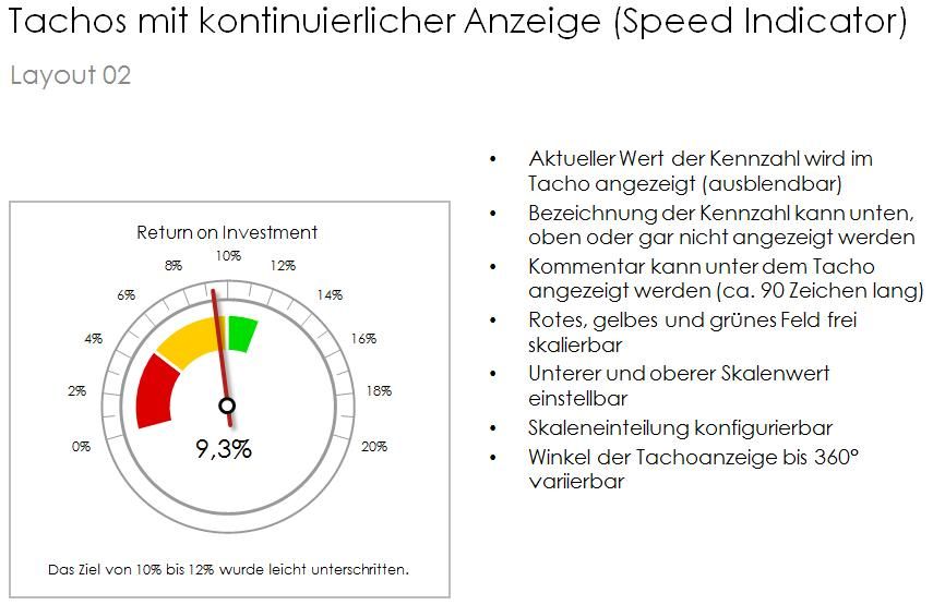 1. Tachometer mit kontinuierlicher (stufenloser) Anzeige (Speed Indicators) zur Anzeige von Größen mit beliebigem Wert (verwendbar für Kennzahlen, die als Prozentzahl, Verhältniszahl oder absolute Zahl dargestellt werden)