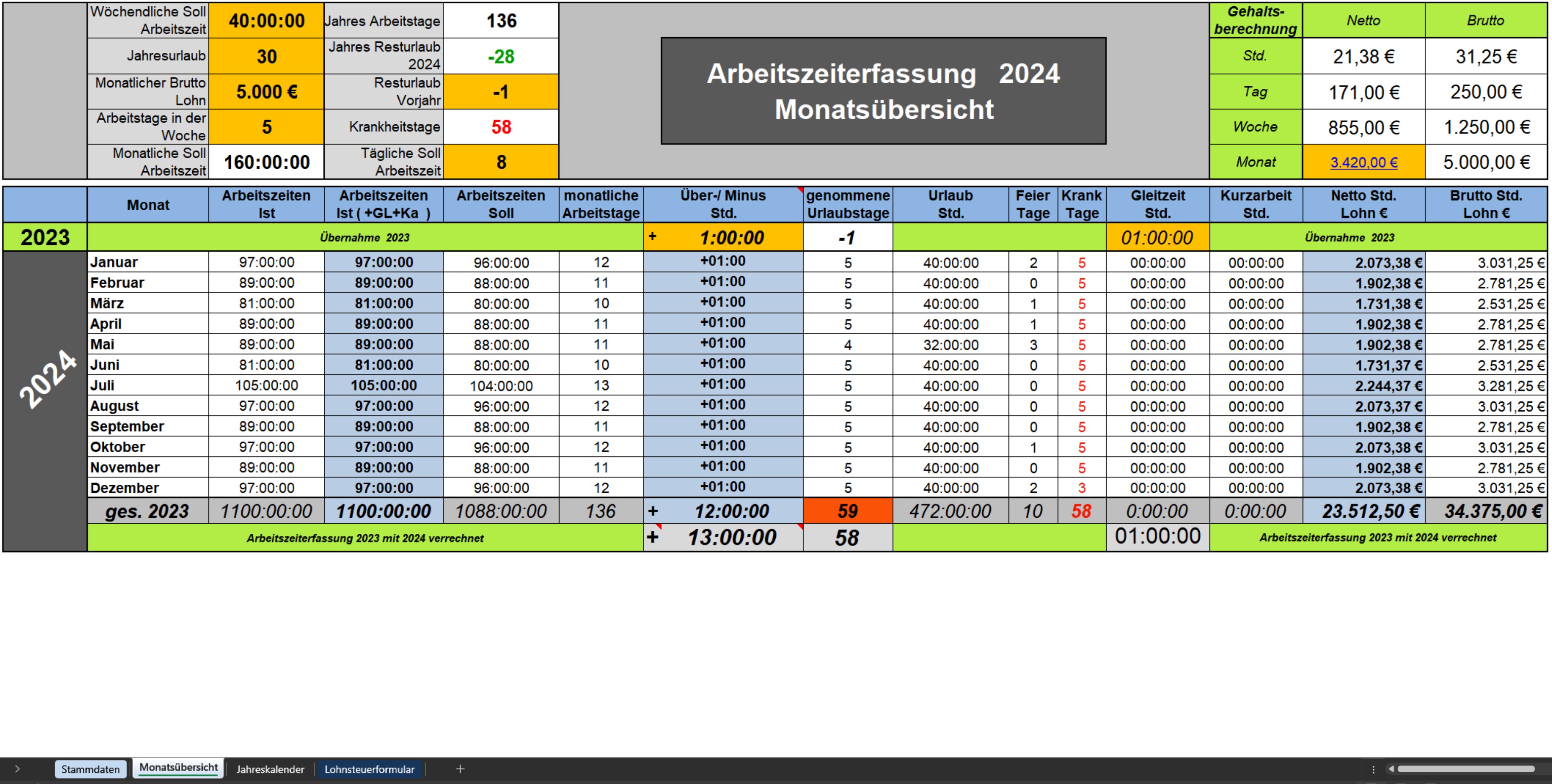 - Über-/Minusstunden mit den eingegebenen Gleitzeitstunden & Kurzarbeitsstunden.