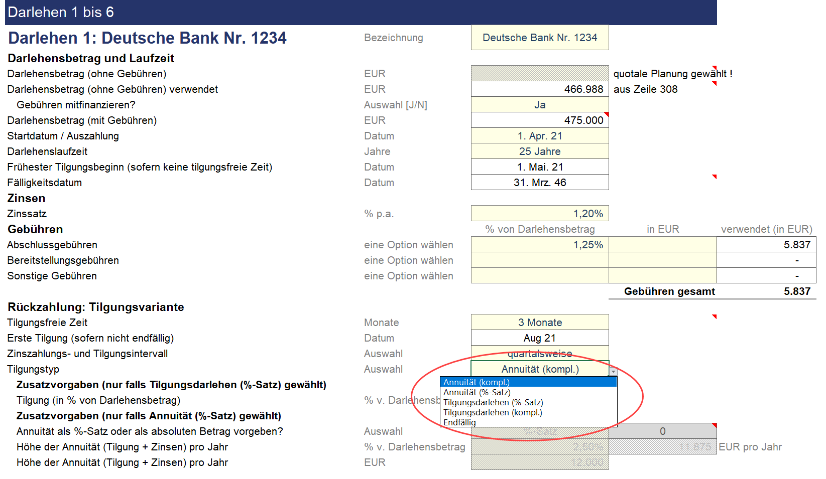 - Umfangreiche Einstellmöglichkeiten je Darlehen (Annuitäten, Tilgungsdarlehen, endfällige Darlehen, Festdarlehen, monatliche, quartalsweise, halbjährliche od. jährliche Zins- u. Tilgungszahlungen, tilgungsfreie Zeiten etc.)