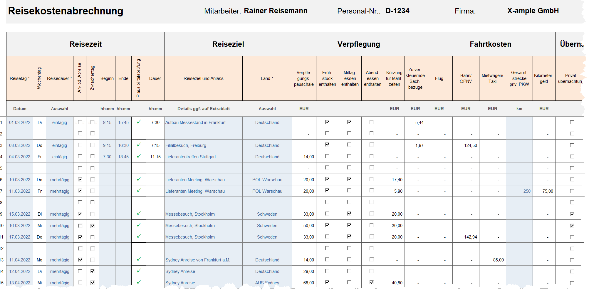 Diese Excel-Vorlage eignet sich zur Reisekostenabrechnung in allen Branchen für Unternehmen, deren Angestellte, Vereine und Organisationen, Gewerbetreibende sowie Freiberufler. Das Tool unterstützt die aktuellen in Deutschland geltenden gesetzlichen und steuerlichen Richtlinien für die Abrechnung von Reisekosten.