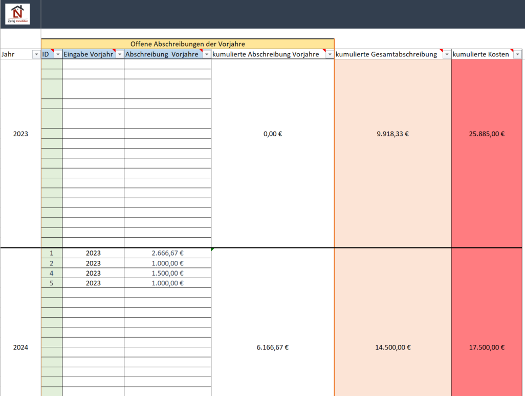 Mit Hilfe einen Bewirtschaftungsplans können Sie sämtliche Kostenarten der Immobilie wie Instandhaltungen, Modernisierungen, Herstellungskosten sowie sonstige Kosten dokumentieren und die Abschreibungsdauer pro Kostenposition festlegen. Darüber hinaus ermöglicht der Bewirtschaftungsplan die Erstellung eines Sanierungsplans, der die Kostenarten über die nächsten Jahre definiert und analysiert. Bei einer Abschreibungsdauer von mehr als einem Jahr können die Abschreibungen manuell auf die nächsten Jahre verteilt werden, um die Steuern und den genauen Cashflow unter Berücksichtigung der Kosten zu ermitteln.